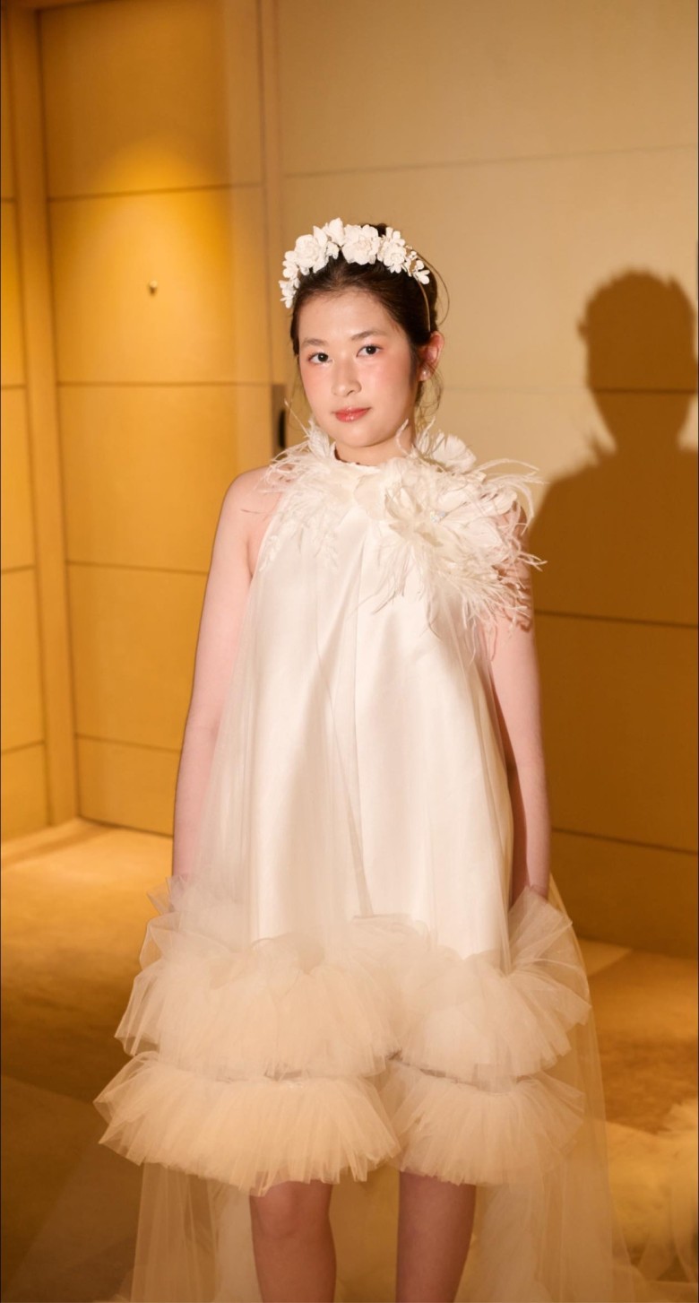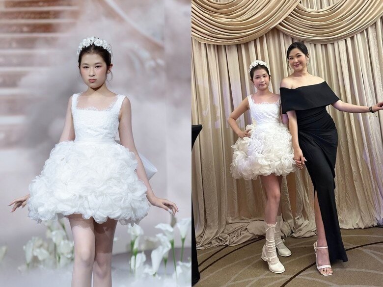 Đây là lần thứ 2 con gái Huy Khánh sải bước trên sân khấu với vai trò người mẫu. Khoảng 10 năm trước, khi mới 3 tuổi, bé lần đầu catwalk cùng bố mẹ trong show giới thiệu các mẫu váy cưới.