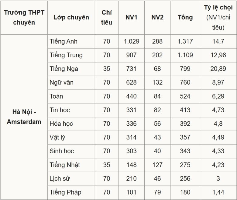 Mùa tuyển sinh 2026 này, THPT chuyên Hà Nội - Amsterdam tiếp tục ghi nhận mức đăng ký NV1 cao nhất ngưởng, dẫn đầu là nhóm chuyên Ngoại ngữ, trong đó Tiếng Nga có tỷ lệ chọi cao nhất trường là 20,89; đứng thứ 2 là Tiếng Anh với con số 14,7 và Tiếng Trung xếp thứ 3 với tỷ lệ chọi 12,96. Chuyên Tiếng Pháp có tỷ lệ chọi thấp nhất trường là 1,44.