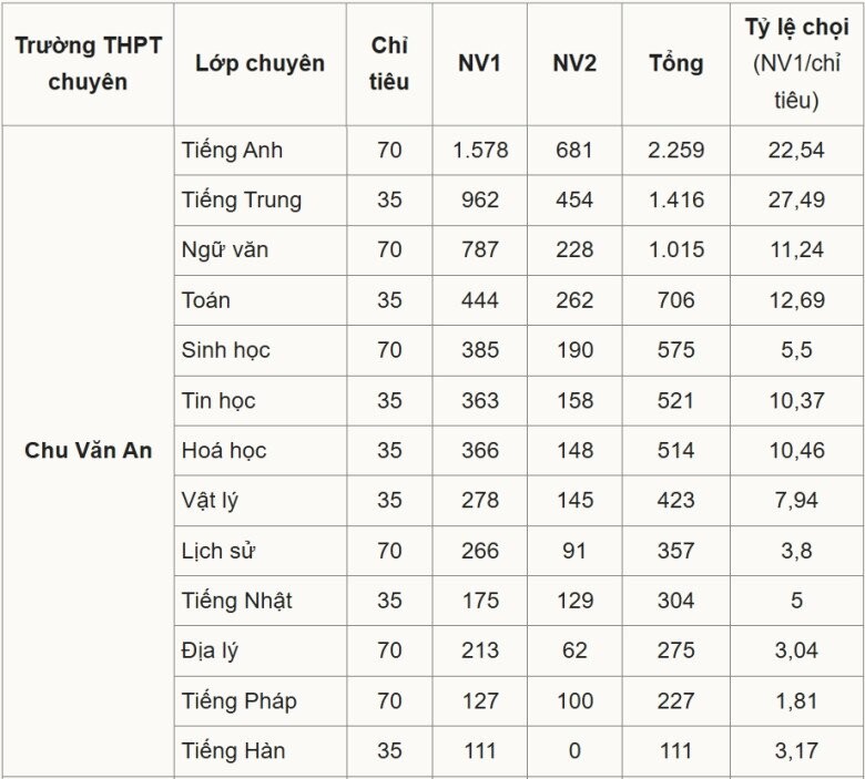 Từ năm học 2025-2026, Trường THPT Chu Văn An (Hà Nội) chính thức chuyển thành trường chuyên, dẫn đến tỷ lệ chọi và điểm chuẩn cũng ở mức cao. Theo dữ liệu năm 2026, chuyên tiếng Trung của trường dẫn đầu với tỷ lệ chọi cao nhất là 27,49 (cao nhất hệ chuyên của cả 4 trường); chuyên Tiếng Anh là 22,54; thấp nhất trường là chuyên Tiếng Pháp với tỷ lệ chọi 1,81.