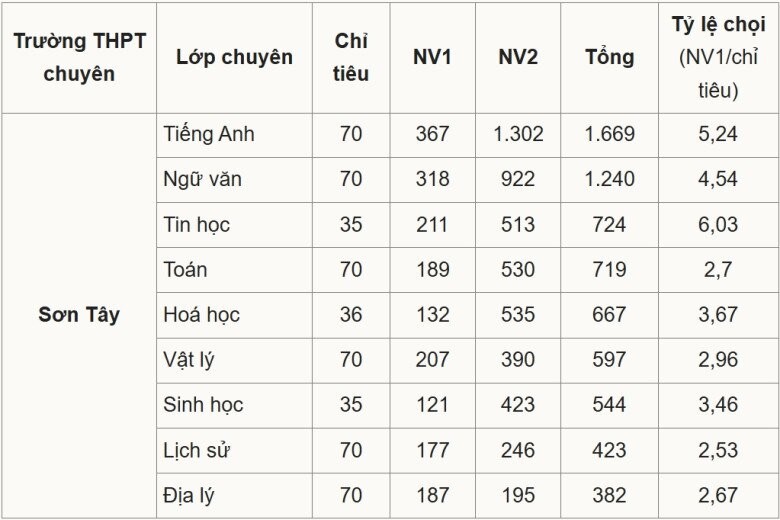 Năm nay, tỷ lệ chọi của trường cao nhất là ở lớp chuyên Tin với mức 6,03. Trong khi đó, lớp chuyên Tiếng Anh của trường có tỷ lệ chọi là 5,24, thấp nhất là chuyên Lịch sử với tỷ lệ chọi 2,53. So với 3 trường THPT chuyên kể trên, THPT chuyên Sơn Tây có số lượng thí sinh đăng ký NV1 ít hơn, tỷ lệ chọi cũng ở mức thấp hơn.