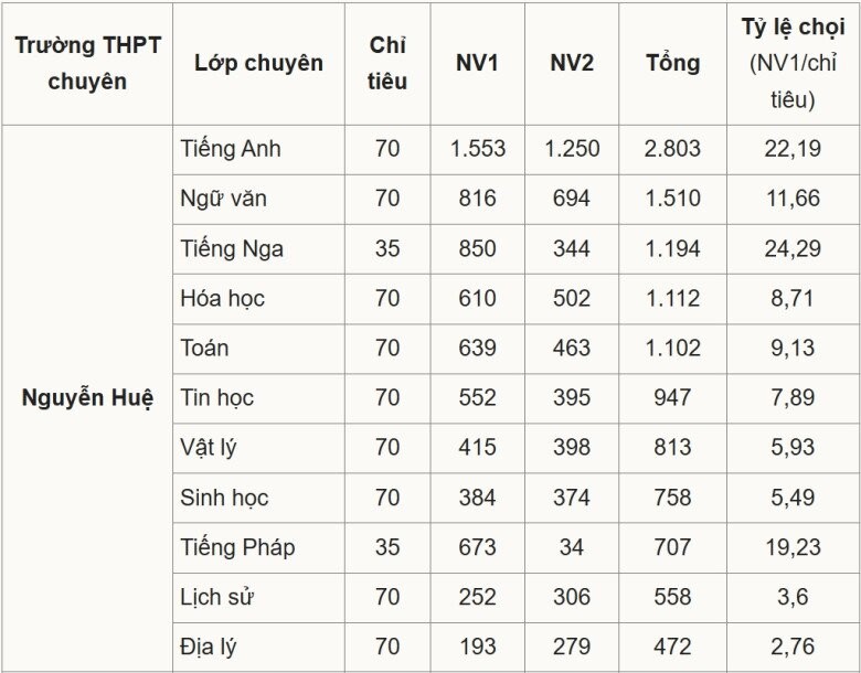 Về điểm chuẩn, Trường THPT chuyên Nguyễn Huệ cũng luôn nắm giữ top đầu. Mùa tuyển sinh 2025 vừa qua, trường lấy điểm đầu vào cao nhất ở lớp chuyên Hóa với 38,25 điểm, theo sau là chuyên Ngữ văn với 37,50; điểm chuẩn các lớp chuyên Tiếng Anh, Tiếng Pháp, Tiếng Nga lần lượt là 36,65; 35,50; 34,00.