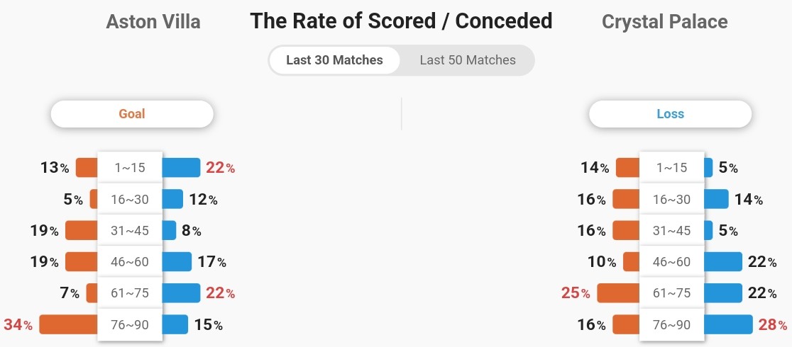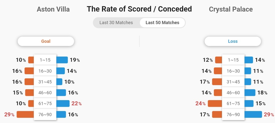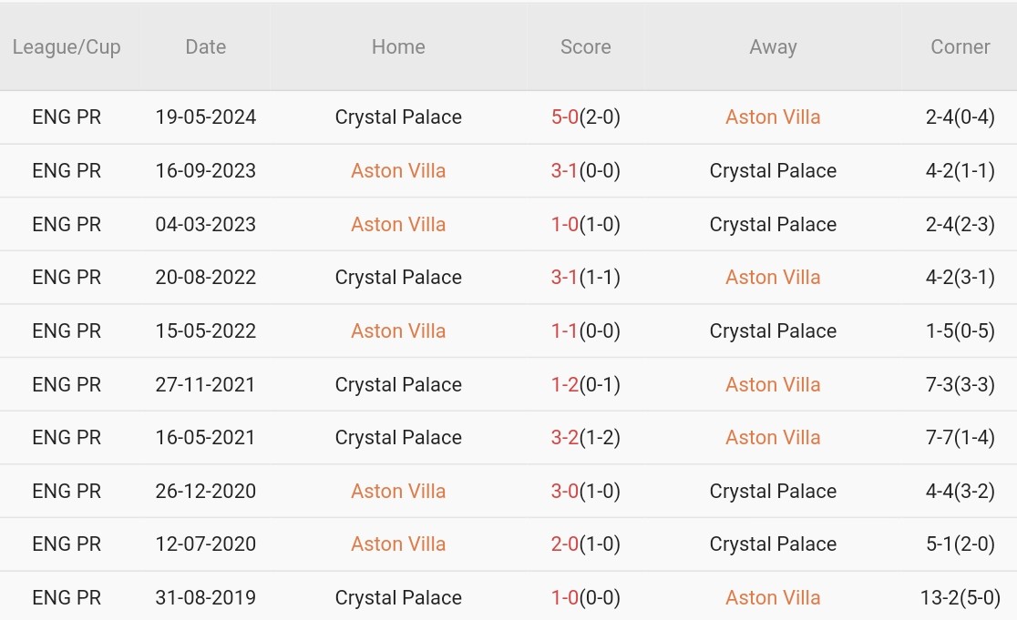 Trong 7 chuyến làm khách gần nhất đến Villa Park, Palace vẫn chưa biết đến cảm giác chiến thắng và phải nhận đến 7 thất bại. Dù vậy, ở lần chạm trán gần nhất, thầy trò Glasner đã hủy diệt CLB vùng Midlands đến 5 bàn không gỡ trên sân nhà.