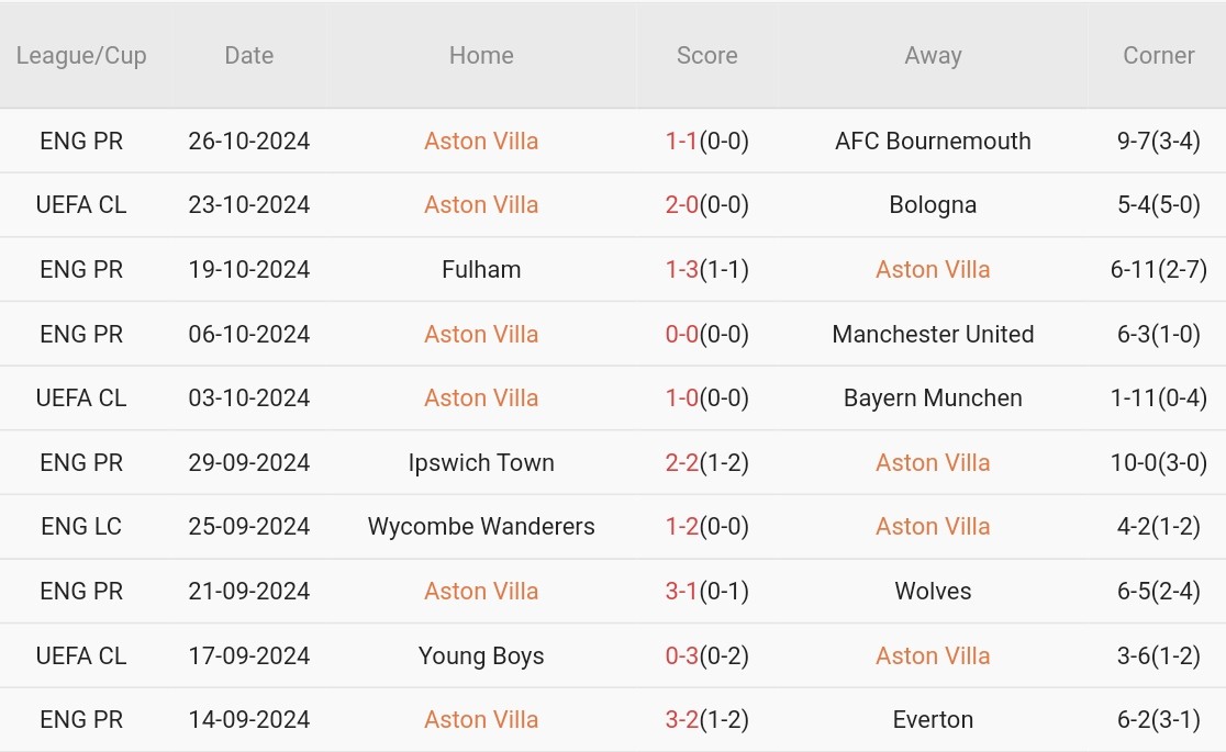 Tuy đã nâng cao chuỗi trận bất bại lên thành con số 11, cuối tuần qua, mạch thắng của Aston Villa đã bị chặn đứng bởi Bournemouth. Pha lập công của Evanilson ở phút 90+6 đã ấn định kết quả hòa 1-1 và khiến Villa đánh rơi chiến thắng, bỏ lỡ cơ hội vượt mặt Arsenal để leo lên vị trí thứ ba trên bảng xếp hạng Premier League.