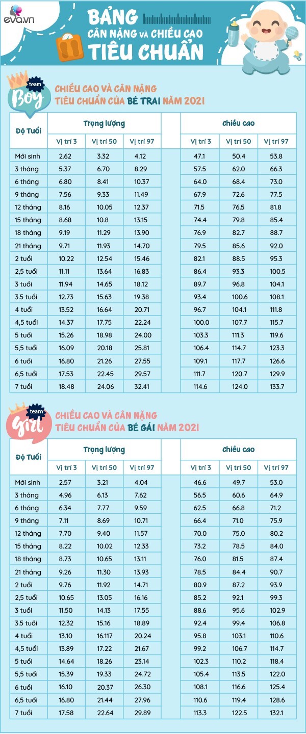 Bảng chiều cao, cân nặng chuẩn của bé trai và bé gái từ 0-7 tuổi (Theo Sohu năm 2021).