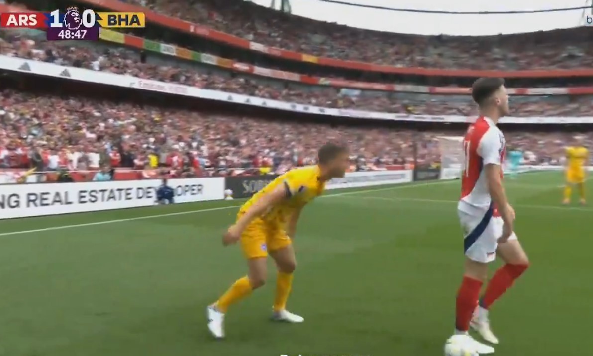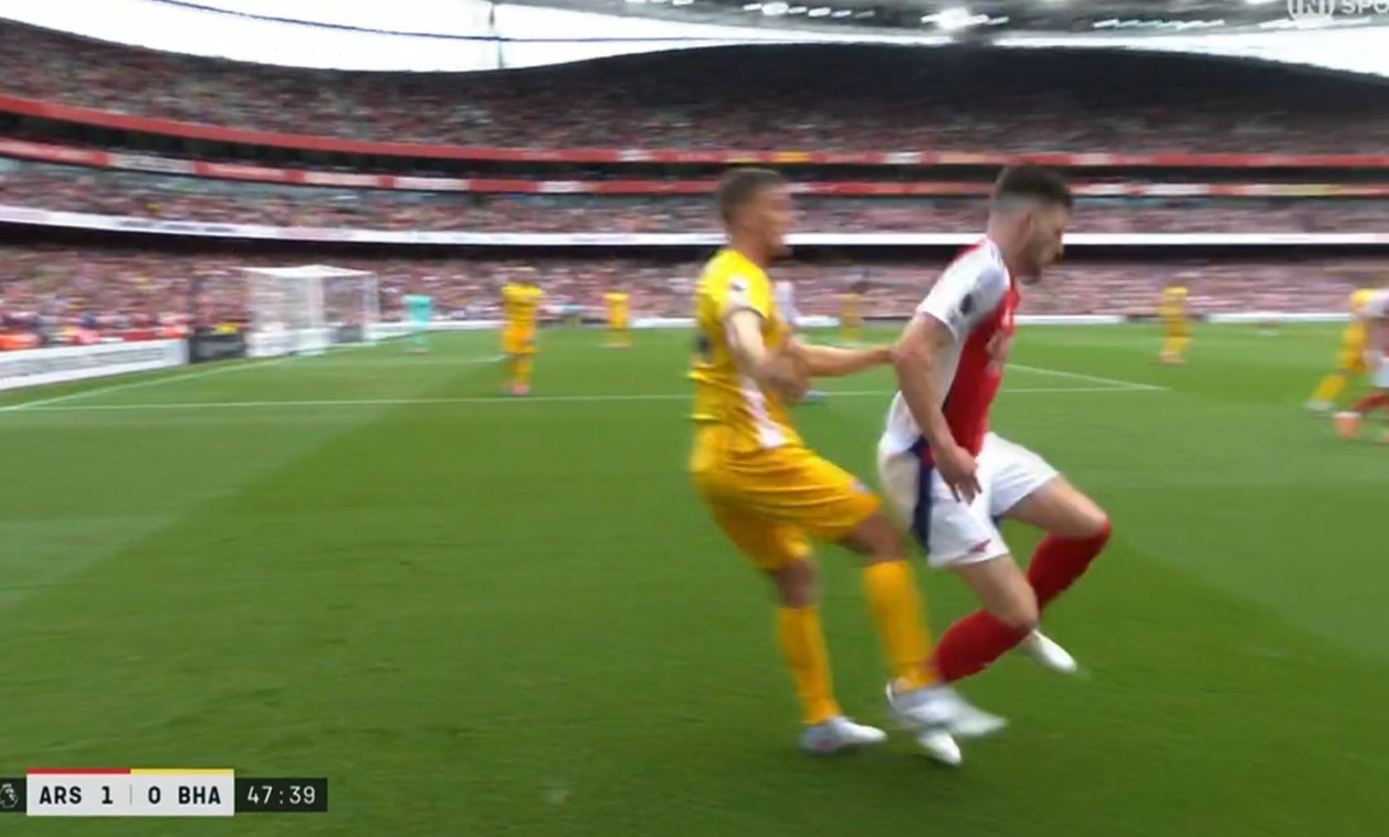 Arsenal đã khởi đầu hiệp một không hề tệ. Họ cầm bóng chủ động và có bàn thắng mở tỷ số do công của Kai Havertz ở phút 38.Tuy nhiên, một biến cố xảy đến ở phút 49 đã làm đảo chiều trận đấu. Từ một pha va chạm thông thường ở phần sân Brighton, cầu thủ đội khách thực hiện một pha đá phạt nhanh. Đáng nói, khi Joël Veltman thực hiện cú phất bóng, Rice không hề nhìn thấy.Để rồi, Rice chạm nhẹ vào bóng theo phản xạ và nhận một cú đá khá đau từ phía sau.Hành động này khiến cả hai xảy ra tranh cãi.Trọng tài Chris Kavanagh quyết định tặng Rice một thẻ vàng nữa vì tội ngăn cản đối thủ đưa bóng vào cuộc.Điều này đồng nghĩa Rice có lần đầu tiên bị truất quyền thi đấu trong sự nghiệp chơi bóng.Rice đã cố phân trần rằng anh không hề cố tình đá vào quả bóng.Thực tế quả bóng mà cầu thủ Brighton định đá vẫn còn trong quỹ đạo lăn, nghĩa là họ không được phép đá phạt nhanh.Chơi thiếu người, Arsenal bị Brighton dồn ép liên tục trong nửa cuối hiệp hai.Arsenal đã để Joao Pedro chọc thủng lưới ở phút 58. Sau đó, HLV Mikel Arteta đã tung tân binh Riccardo Calafiori vào sân ở phút 69 để gia cố thêm cho hàng thủ. Arsenal chấp nhận tử thủ và bảo toàn 1 điểm trong thế thiếu người.