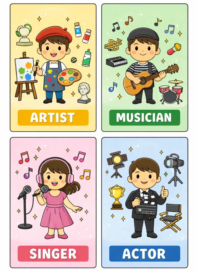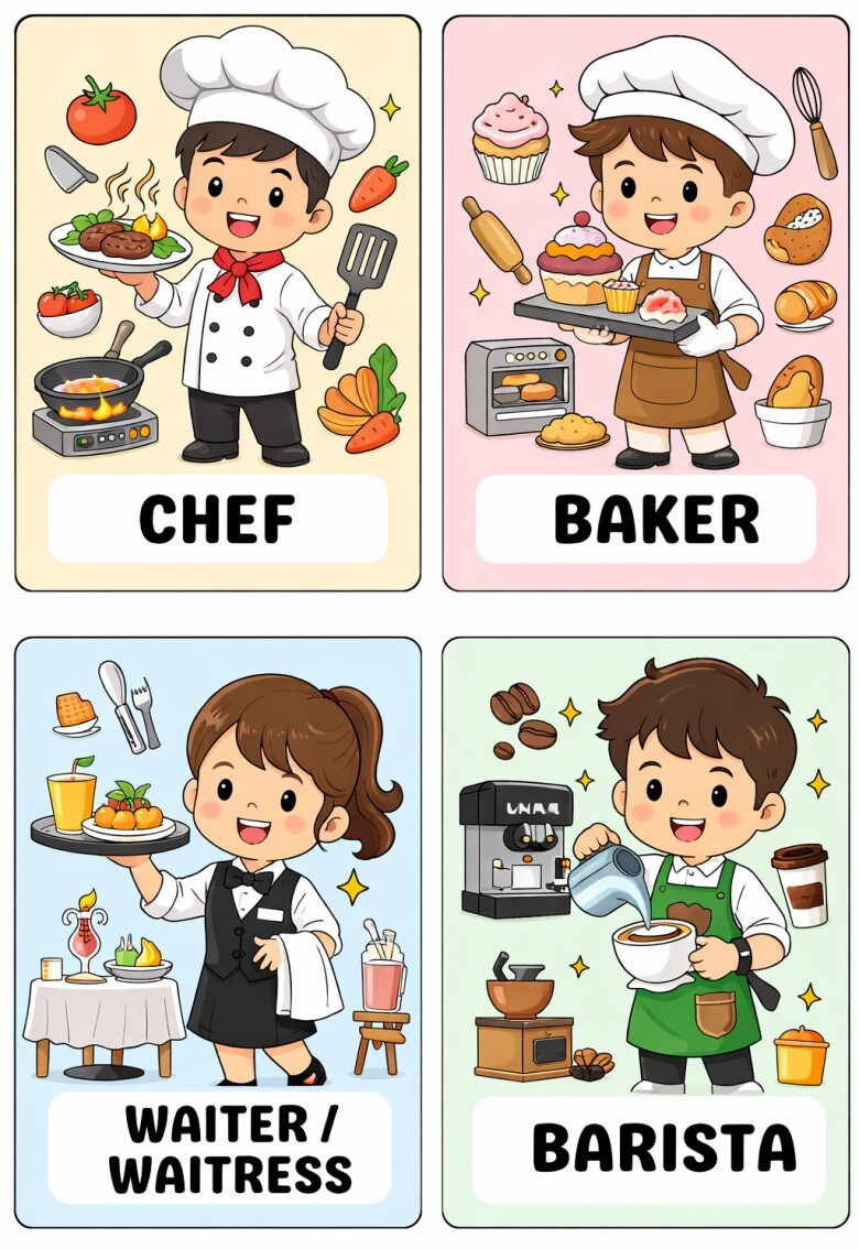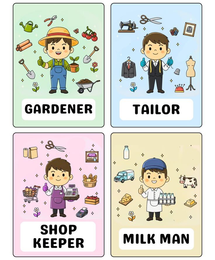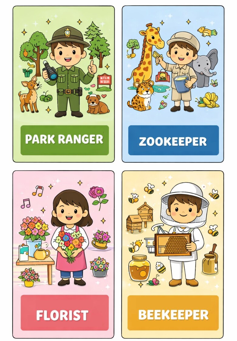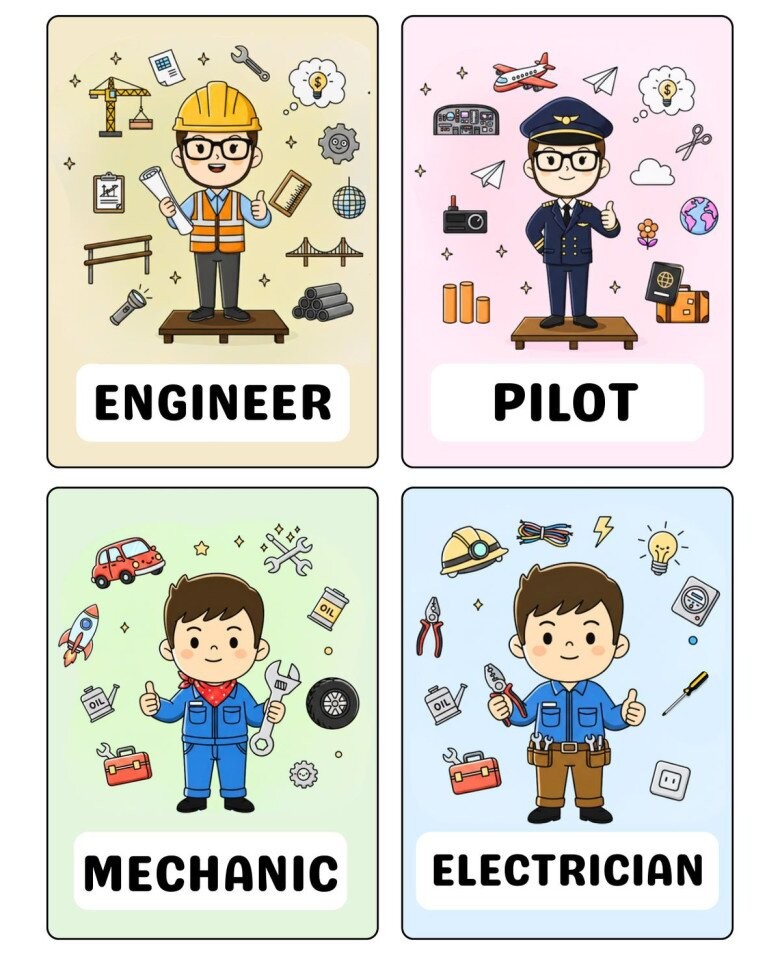 Khi học cùng flash card, trẻ được nghe và đọc tên nghề nghiệp, đồng thời có thể mô tả hành động trong tranh. Việc này giúp tăng vốn từ và rèn luyện khả năng diễn đạt.