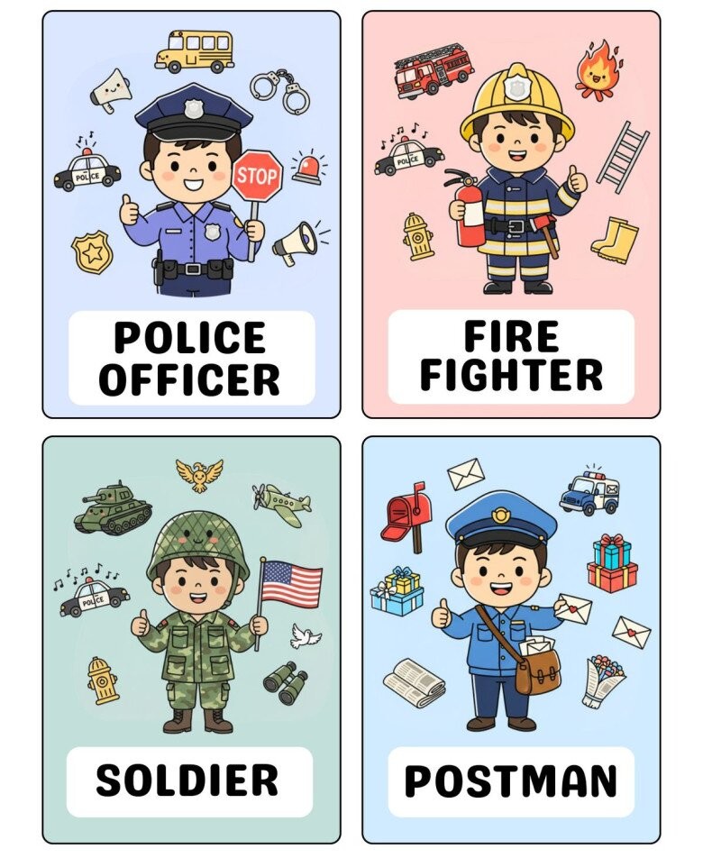 Flash card là những tấm thẻ nhỏ có hình ảnh minh họa rõ ràng, kèm theo chữ hoặc tên gọi. Đối với chủ đề nghề nghiệp, mỗi tấm thẻ thường thể hiện một nhân vật đang làm công việc cụ thể, chẳng hạn như bác sĩ đang khám bệnh, cô giáo đang dạy học, hay lính cứu hỏa đang dập lửa. Hình ảnh sinh động giúp trẻ dễ dàng ghi nhớ và liên tưởng đến công việc của từng nghề.