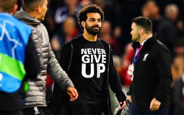 Salah đã hòa vào bầu không khí ồn ã tại Anfield với dòng chữ "không bao giờ từ bỏ".