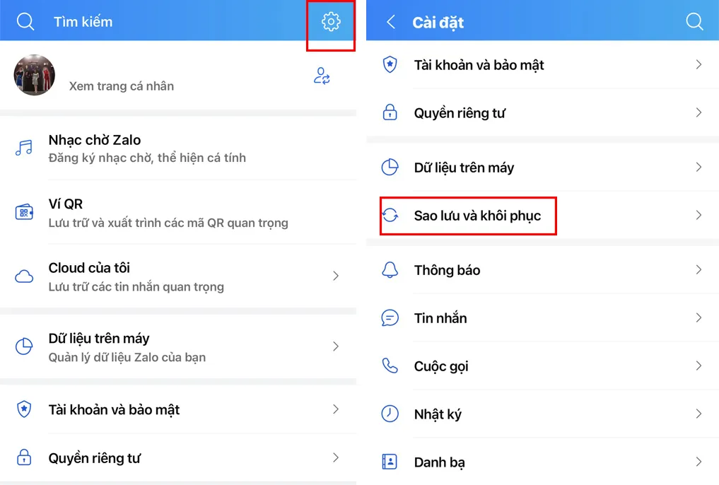 Bước 1. Mở ứng dụng Zalo, nhấn vào biểu tượng hình người ở góc dưới bên phải, sau đó chọn biểu tượng Cài đặt (hình bánh răng) ở góc trên bên phải. chọn Sao lưu và khôi phục.