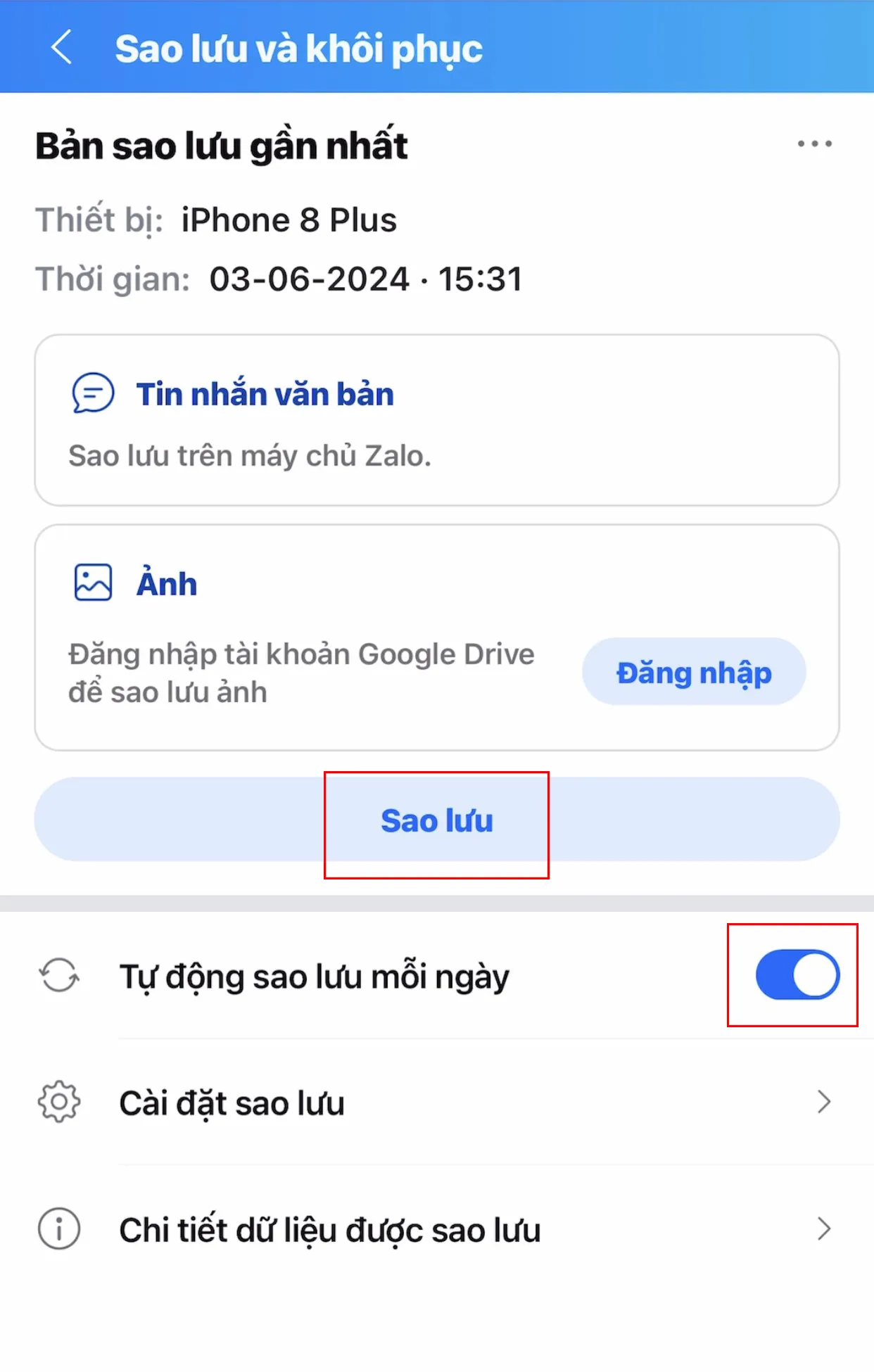Bước 2. Tại đây, bạn có thể nhấn Sao lưu để tiến hành sao lưu lại tin nhắn. Để tự động sao lưu mỗi ngày, bạn chọn "Tự động sao lưu mỗi ngày".