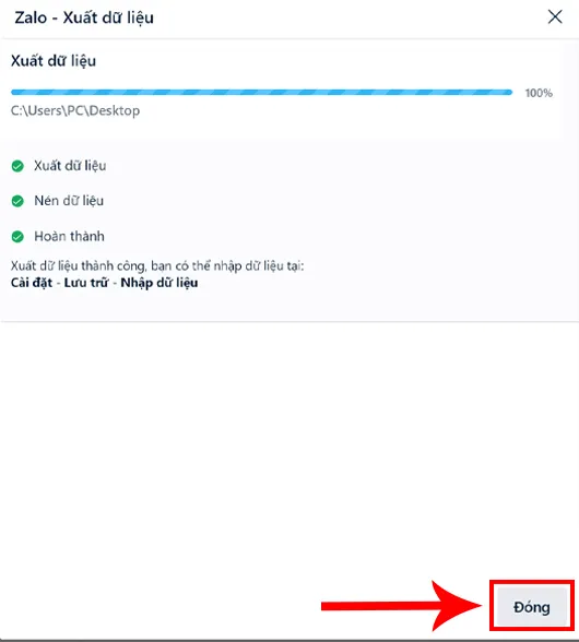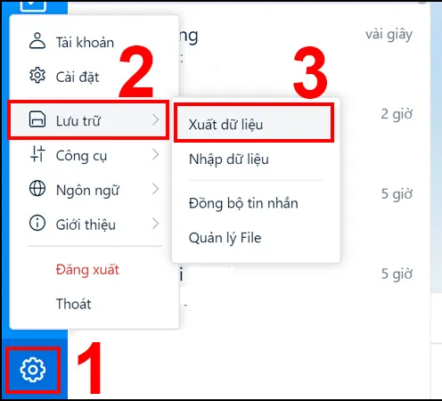 Bước 1. Mở ứng dụng Zalo trên máy tính của bạn. Nhấn vào biểu tượng Cài đặt ở góc dưới bên trái, sau đó chọn "Lưu trữ". Nhấp vào "Xuất dữ liệu"