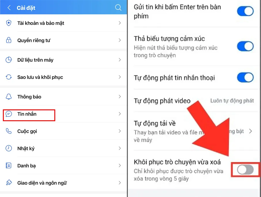 Bước 2. Bật nút "Khôi phục trò chuyện vừa xóa", hệ thống sẽ tự động khôi phục lại tin nhắn vừa xóa trong vòng 5 giây.