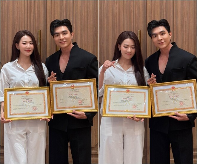 Cặp đôi Steven Nguyễn và Minh Trang hãnh diện khoe khoảnh khắc được nhận bằng khen của Bộ trưởng Bộ Quốc phòng.