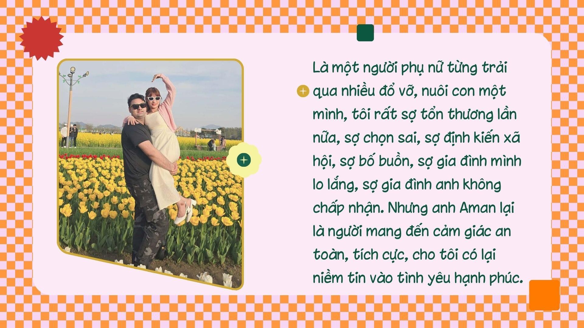 Từ những hành động đó chị bắt đầu suy nghĩ lại. “Là một người phụ nữ từng trải qua nhiều đổ vỡ, nuôi con một mình, tôi rất sợ tổn thương lần nữa, sợ chọn sai, sợ định kiến xã hội, sợ bố buồn, sợ gia đình mình lo lắng, sợ gia đình anh không chấp nhận. Nhưng anh Aman lại là người mang đến cảm giác an toàn, tích cực, cho tôi có lại niềm tin vào tình yêu hạnh phúc.