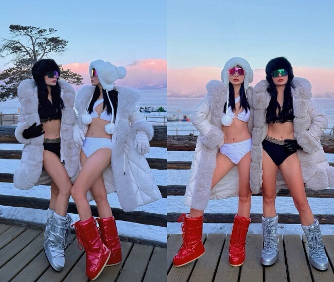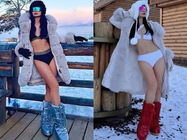 Thúy Hằng - Thúy Hạnh diện bikini táo bạo, khoe chân dài cực phẩm giữa trời tuyết.