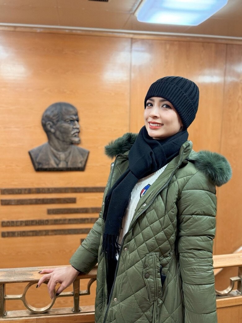 Thúy Hạnh dí dỏm kể lại: "Khúc này khoảng 8 giờ sáng mà mặt trời mới chỉ lấp ló chưa chịu lên cao, gió thổi đùng đùng, hai nàng chạy ra làm demo trước vài dáng trên bờ rồi mới hò nhau lao ra giữa hồ Baikal đang đóng băng. Nói chung là mát lạnh".