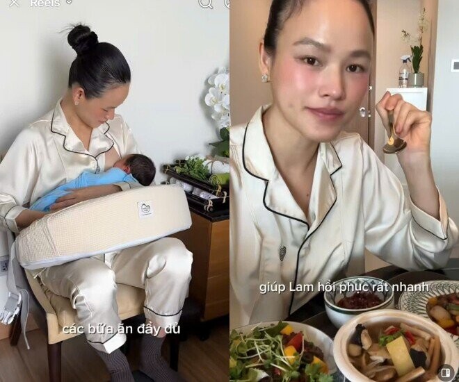 Trong thời gian ở cữ, cô duy trì chế độ ăn uống đầy đủ dinh dưỡng, kết hợp nghỉ ngơi hợp lý. Mỗi ngày của cô bắt đầu bằng những thói quen đơn giản như uống trà ấm, chăm sóc da, sau đó dành thời gian cho con và xử lý công việc.
