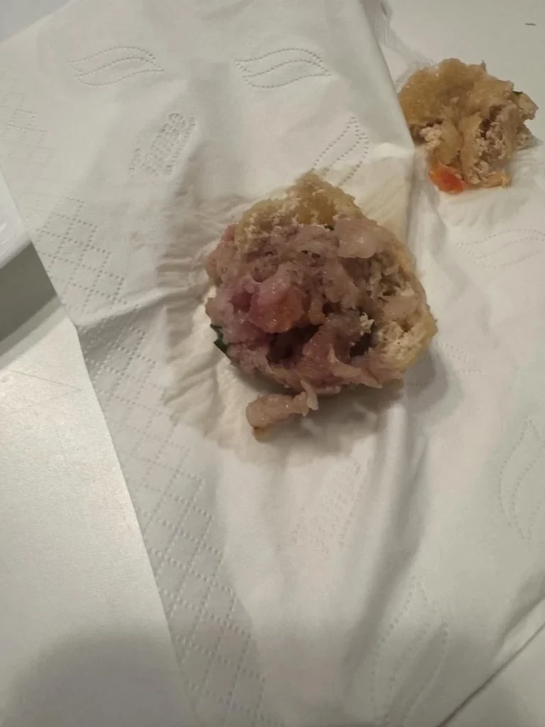 Nhìn lại phần thịt lợn trong món ăn, Coffee nhận ra thịt vẫn còn sống hoàn toàn. Một số miếng vẫn còn màu hồng, rõ ràng chưa hề chín. Ngay lập tức, cô chạy vào nhà vệ sinh cố gắng nôn ra. Tuy nhiên, dù cố thế nào, cô cũng chỉ nôn được một ít thịt sống màu hồng. Chồng cô thấy vậy liền khuyên cô dừng lại.