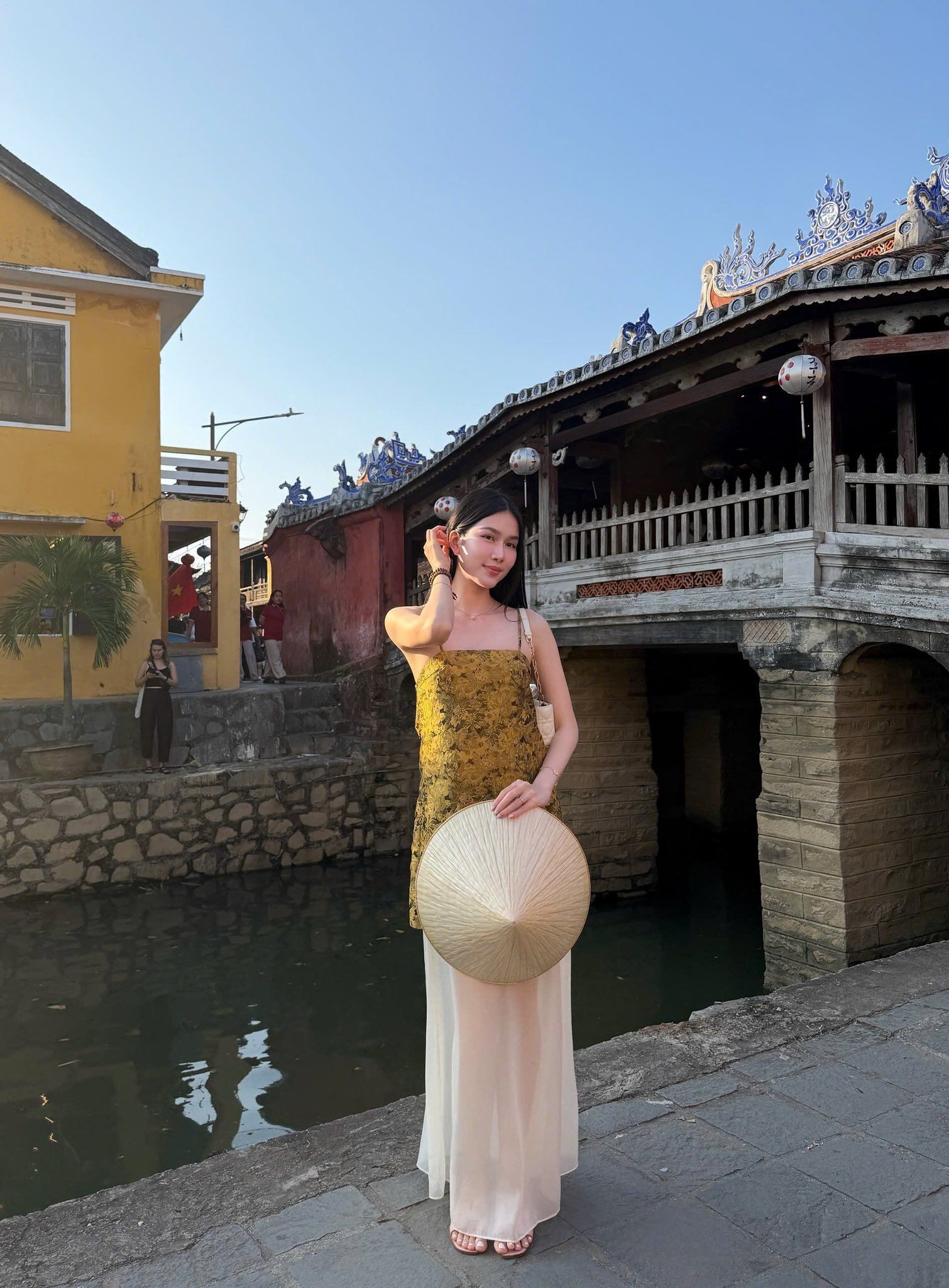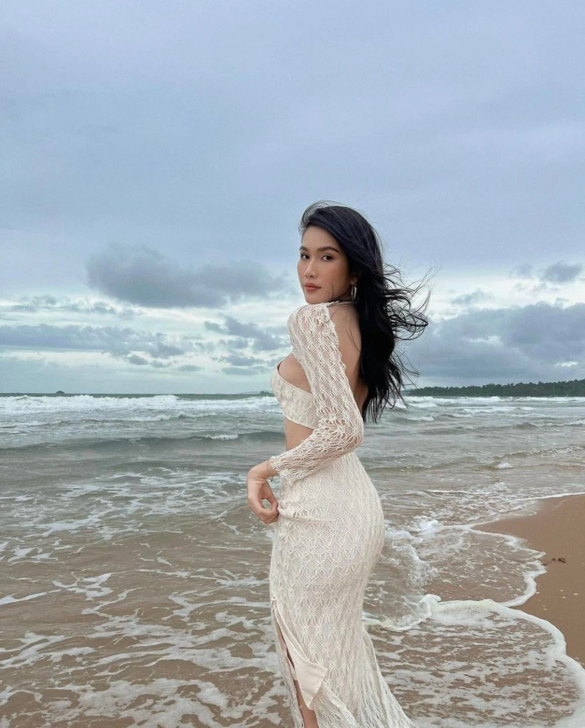 Điểm khéo léo nằm ở cách phối đồ. Thay vì diện nguyên set táo bạo, cô kết hợp bikini với quần dài cạp cao, vừa giữ ấm vừa tiết chế độ hở. Thiết kế này giúp ôm nhẹ vòng eo, kéo dài tỷ lệ phần thân dưới và tạo hiệu ứng đôi chân thanh thoát hơn nhờ phom suông rủ thẳng. Cách khoác áo buông lơi càng làm nổi bật đường cong cơ thể nhưng vẫn tạo cảm giác tự nhiên, không gò bó.