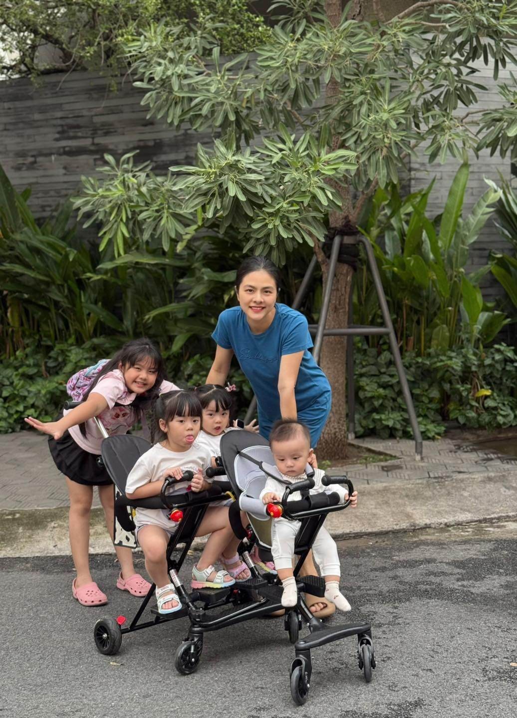 Nữ diễn viên được ông bà nội ngoại giúp đỡ trong cuộc sống hàng ngày, còn ông xã Hữu Quân đảm nhận phần đưa con 4 nhóc tì đi học hay kèm cặp hàng ngày.