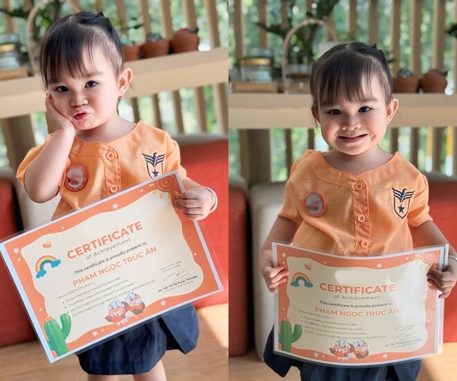Nữ diễn viên hạnh phúc chia sẻ: "Tấm giấy khen đầu tiên của con". Cô đăng tấm ảnh ghi lại khoảnh khắc Lita còn mặc nguyên đồng phục trường, khiến mọi người "tan chảy" bởi biểu cảm đáng yêu, chu môi nghịch ngợm trước ống kính.