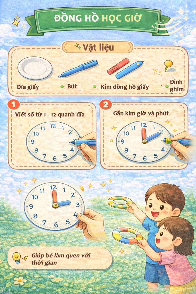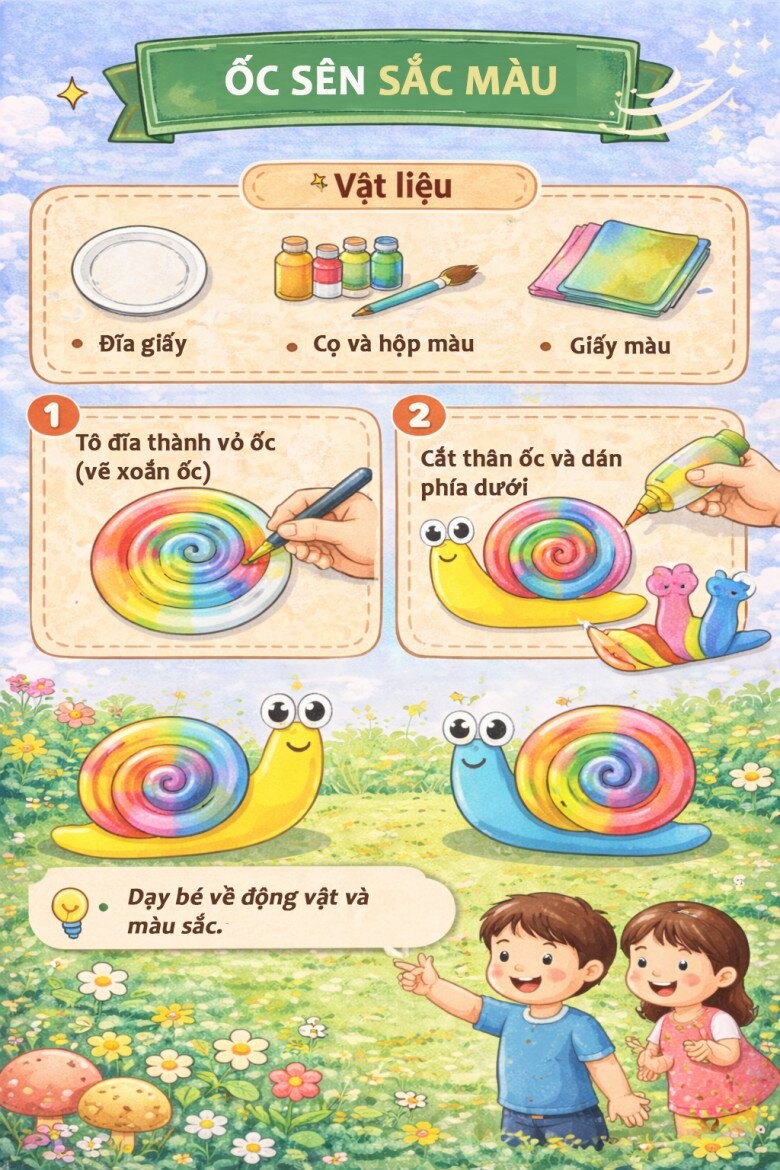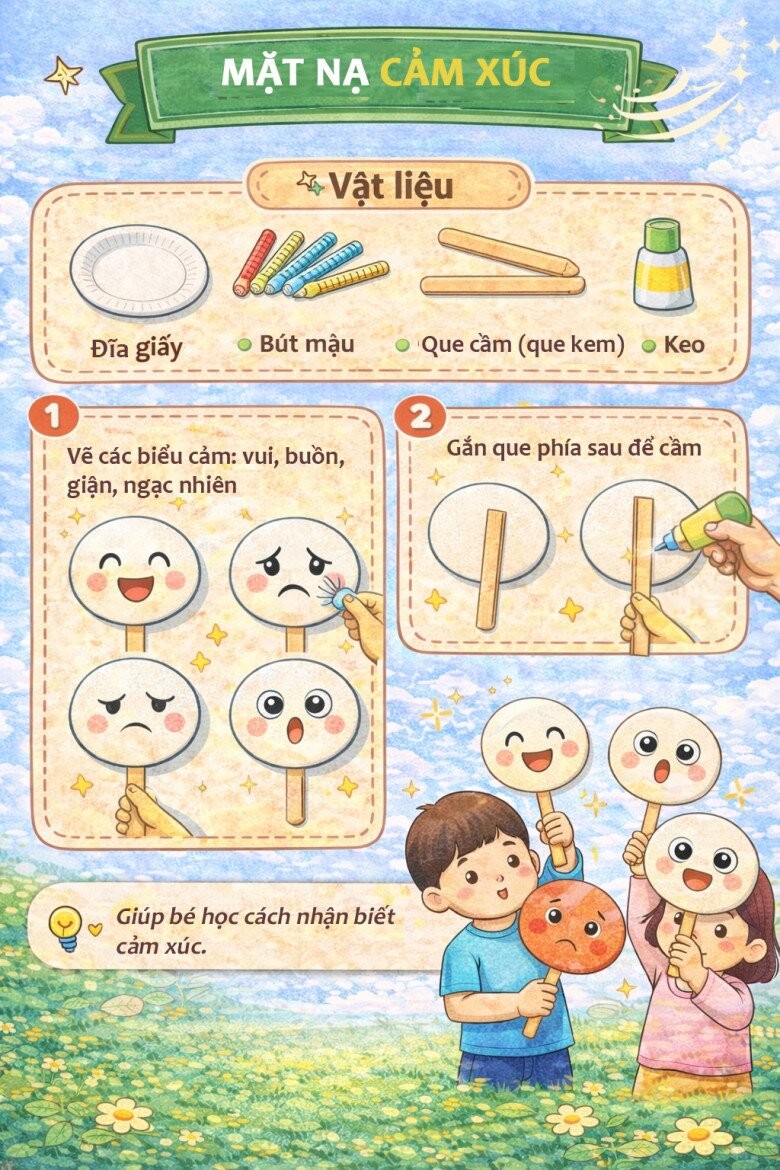Từ những vật liệu quen thuộc như đĩa giấy, bút màu, giấy màu hay keo dán, bố mẹ có thể cùng bé tạo nên vô số sản phẩm thú vị như con vật, mặt nạ, đồng hồ hay các trò chơi vận động.