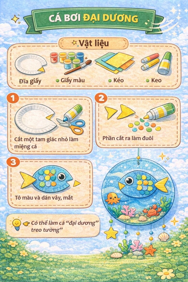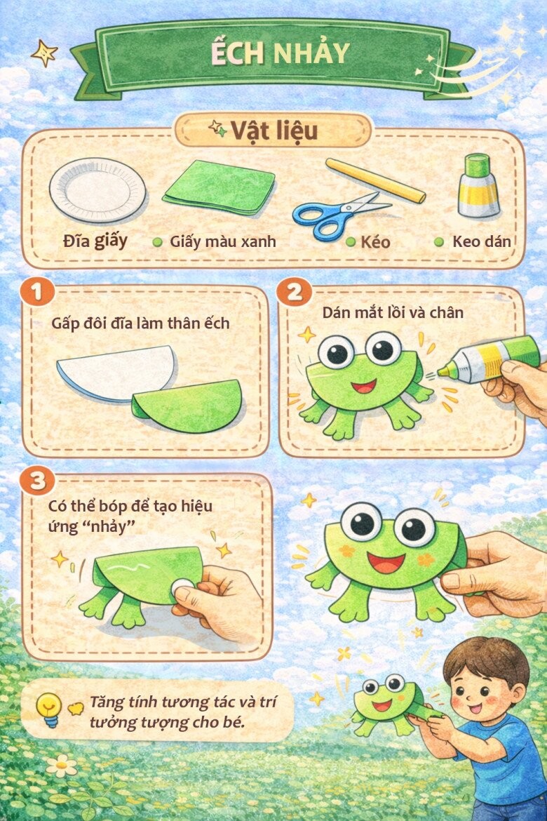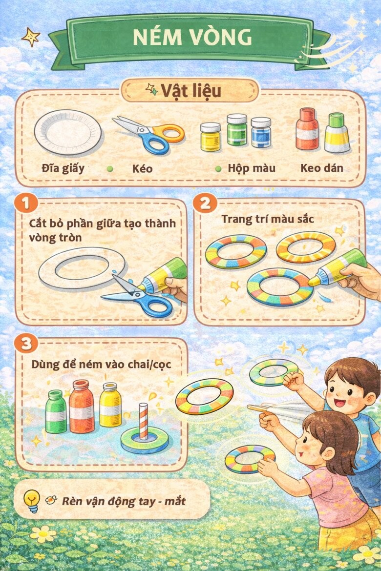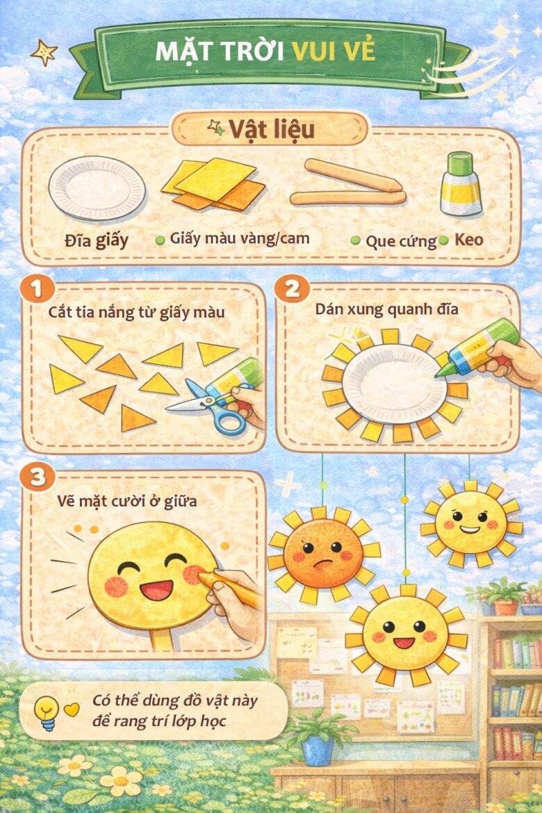 Từ những vật liệu quen thuộc như đĩa giấy, bút màu, giấy màu hay keo dán, bố mẹ có thể cùng bé tạo nên vô số sản phẩm thú vị như con vật, mặt nạ, đồng hồ hay các trò chơi vận động.