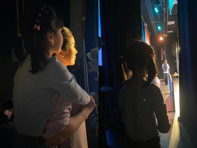 Bông theo dõi mẹ diễn kịch trên sân khấu.