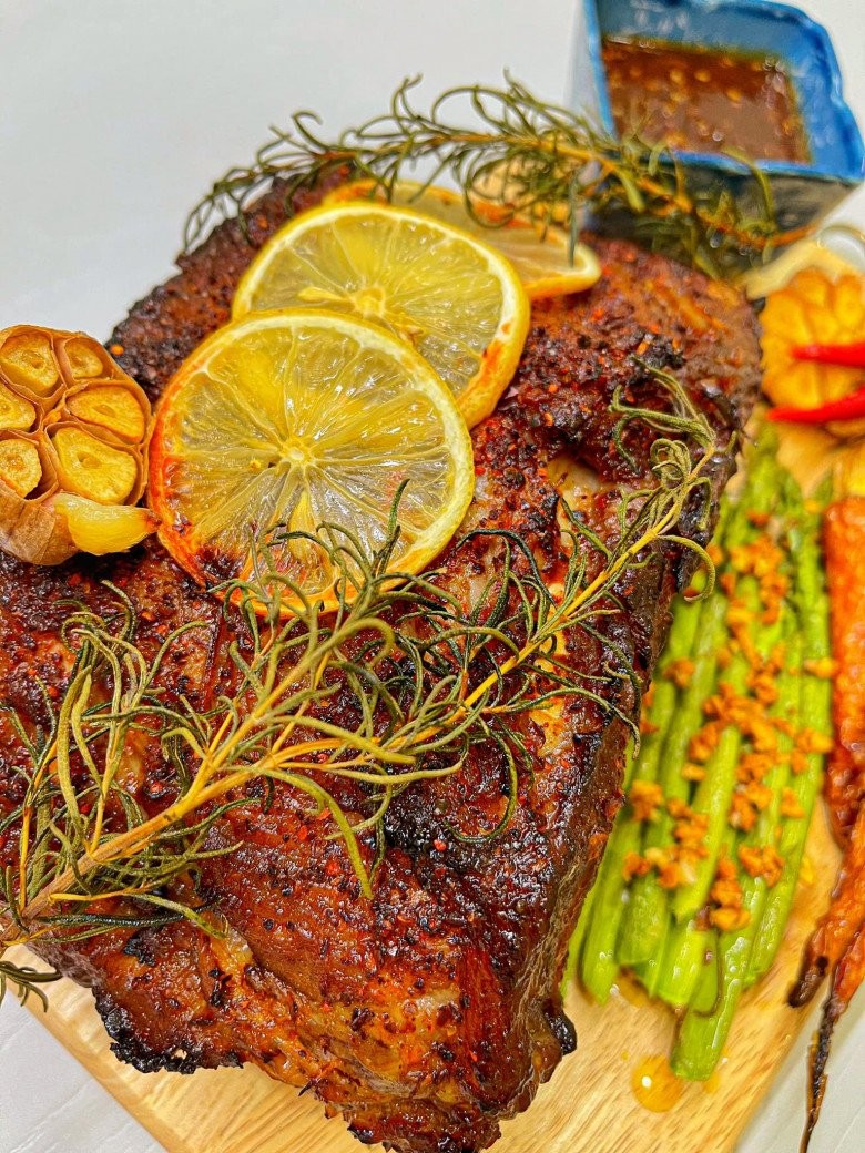 Sau đó cho thêm vài lát chanh vàng, hương thảo lên mặt sườn.