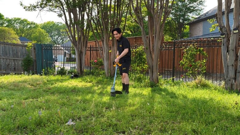 Dù là lần đầu sử dụng máy cắt cầm tay nhưng anh vẫn thao tác khá thuần thục để làm sạch những mảng cỏ mọc um tùm.