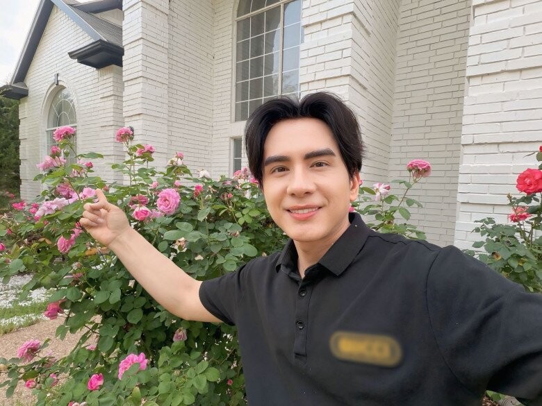 Chủ nhân ngôi nhà tự hào khoe khéo dàn hoa hồng đang độ nở rộ ngay trước thềm cửa chính. Nam ca sĩ dí dỏm nhận xét rằng chiều cao của các bụi cây năm nay phát triển vượt bậc, gần bằng với vóc dáng của chính mình.