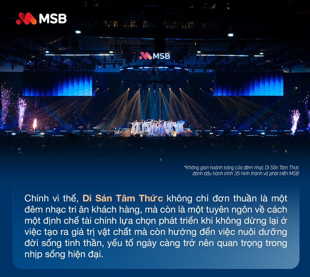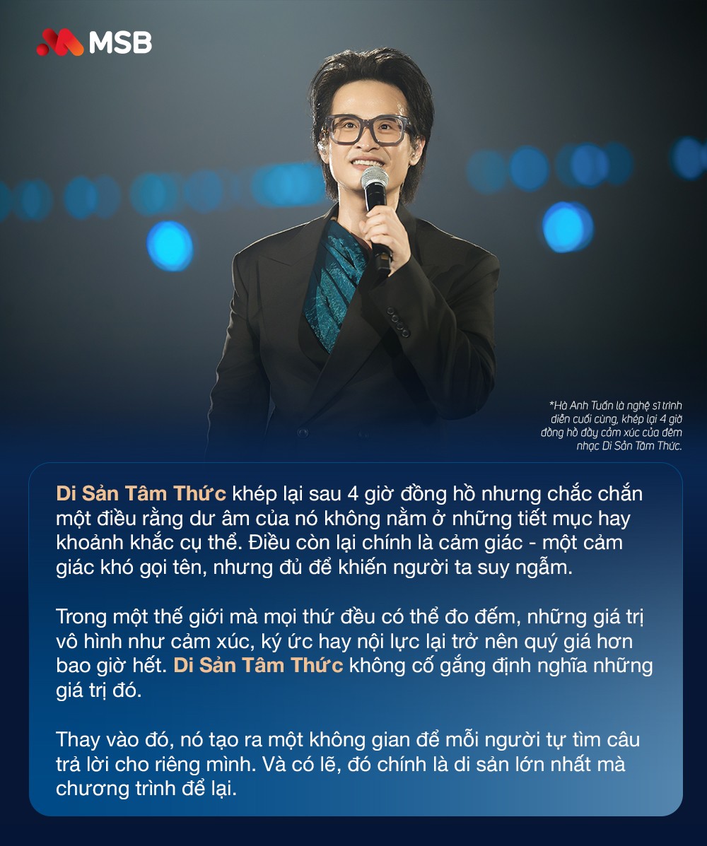 Ba thập kỷ rưỡi - nếu chỉ nhìn ở góc độ thời gian, đó là một hành trình đủ dài để tạo dựng vị thế. Nhưng nếu nhìn sâu hơn, đó còn là quá trình tích lũy của niềm tin, của những lần đồng hành, của những khoảnh khắc thấu hiểu giữa một thương hiệu và khách hàng. Và cũng chính từ những tích lũy ấy, một dạng “di sản” vô hình dần được hình thành, không nằm ở những con số hay thành tựu hữu hình mà nằm trong ký ức, cảm xúc và trải nghiệm của mỗi con người. Đó cũng là lý do Di Sản Tâm Thức ra đời - như một điểm chạm đặc biệt trong hành trình kỷ niệm 35 năm của MSB. Không phải là một sự kiện mang tính phô diễn, mà là một lời tri ân được kể bằng ngôn ngữ tinh tế hơn, nơi không gian âm nhạc và nghệ thuật hòa quyện thành một.