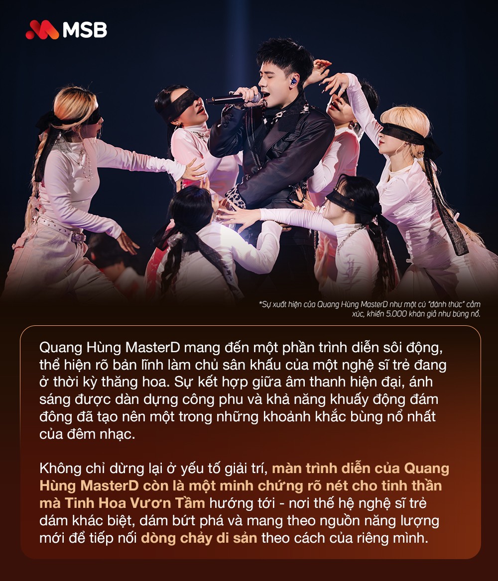 Và khi hành trình ấy bước sang chương Tinh Hoa Vươn Tầm, sân khấu không còn chỉ là nơi dẫn dắt nội tâm, mà trở thành không gian của sự bứt phá. Sự xuất hiện của Quang Hùng MasterD như một cú “đánh thức” cảm xúc, kéo toàn bộ không khí từ trạng thái lắng đọng sang bùng nổ. Không còn những khoảng lặng chiêm nghiệm, từng nhịp beat dồn dập hòa cùng hiệu ứng ánh sáng đa tầng đã biến sân khấu thành một điểm hội tụ năng lượng, nơi 5.000 khán giả cùng hòa chung một nhịp cảm xúc.