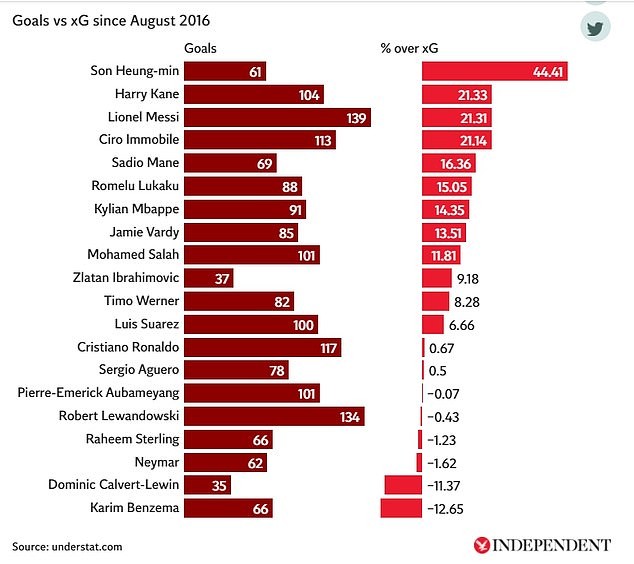 Và thống kê từ understat chỉ ra rằng, kể từ tháng 08/2016 tới nay, Son chính là cầu thủ sở hữu khả năng dứt điểm đáng sợ bậc nhất thế giới.