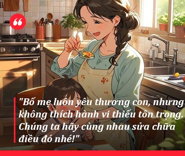 Hàn gắn các mối quan hệ và củng cố sự tôn trọng: "Bố mẹ luôn yêu thương con, nhưng không thích những hành vi thiếu tôn trọng. Chúng ta hãy cùng nhau sửa chữa điều đó nhé!"