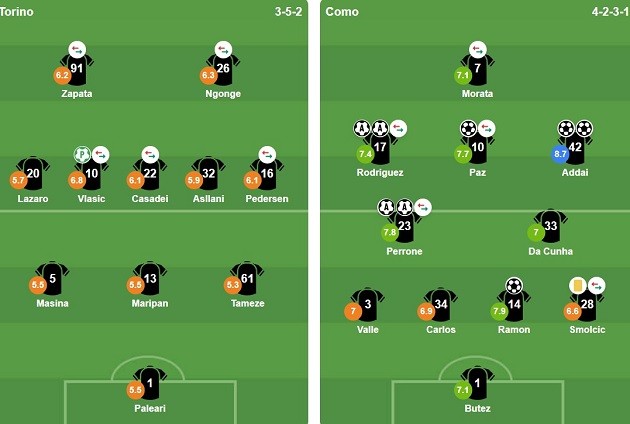 Trong thế trận mất kiểm soát, Torino tiếp tục để lộ khoảng trống. Nico Paz, người đang được Chelsea theo đuổi, tận dụng cơ hội để nâng tỷ số lên 4-1, trước khi Baturina hoàn tất chiến thắng 5-1 sau sai lầm mất bóng của Tameze. Với kết quả này, Como nối dài chuỗi trận bất bại lên con số mười và tạm thời vượt Juventus để vươn lên vị trí thứ sáu trên bảng xếp hạng.