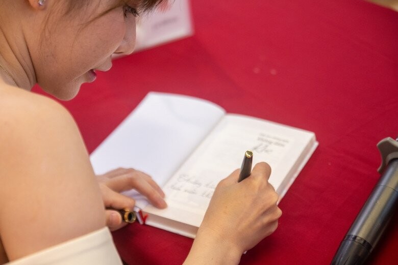 Tú Uyên ký tặng độc giả tại sự kiện.