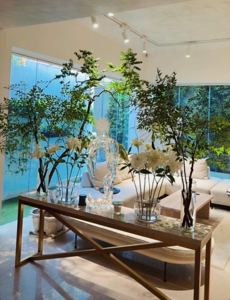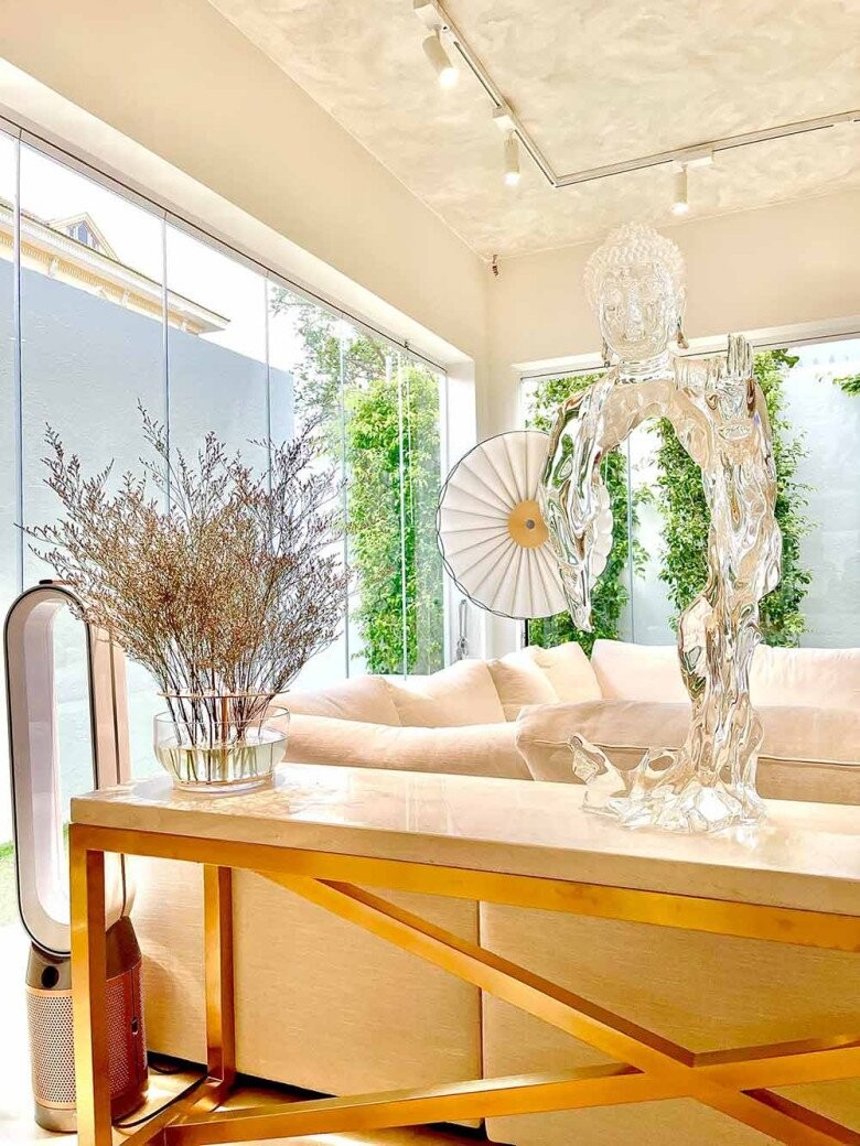 Điểm nhấn trong căn nhà không chỉ nằm ở nội thất đắt giá mà còn ở sự chăm chút tỉ mỉ của nữ ca sĩ. Đặc biệt, phòng khách nổi bật với bộ sofa lớn cùng tượng Phật trong suốt, mang đến cảm giác thanh tịnh và bình yên. Đây cũng là nơi Hồ Ngọc Hà thường xuyên đặt những bình hoa tươi, như một cách thổi hồn vào không gian sống.