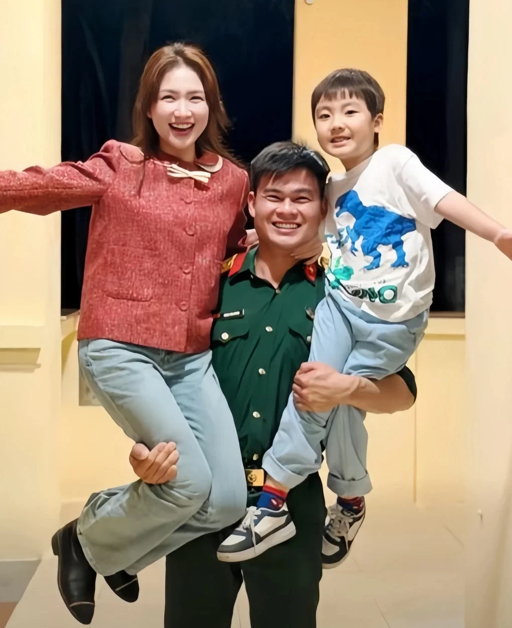 Đại úy Văn Cương đưa Hòa Minzy và bé Bo vào thăm đơn vị.