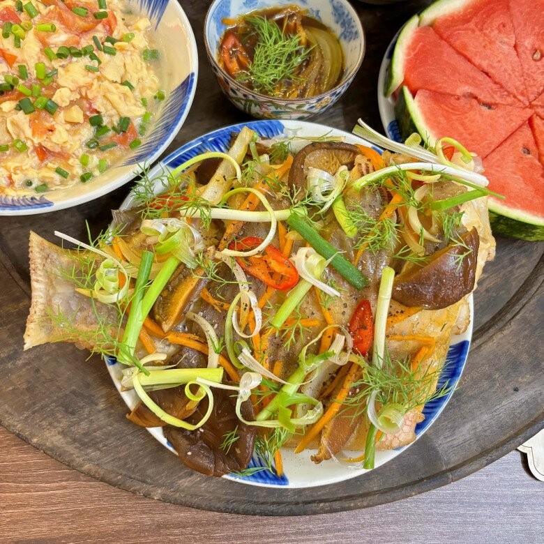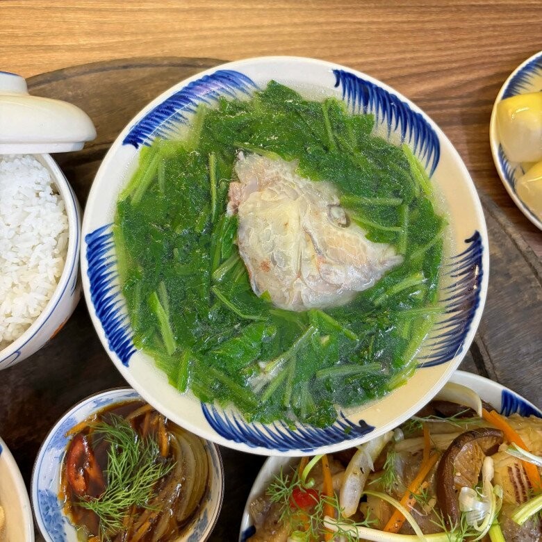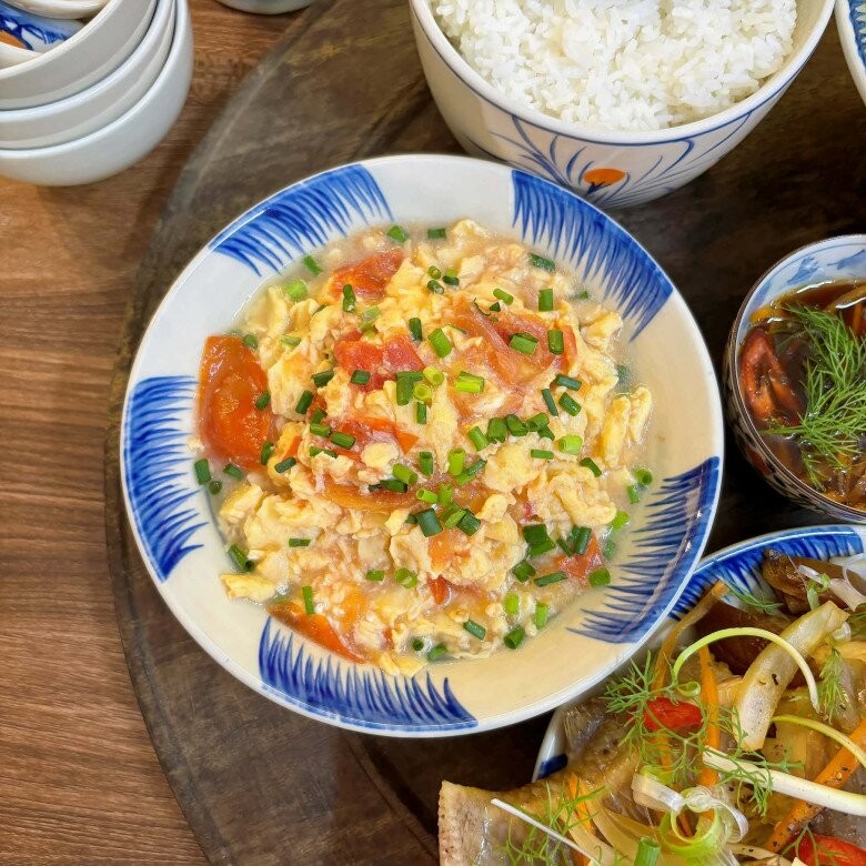 Mâm cơm giản dị mà đưa cơm, đủ đầy hương vị chỉ với những món quen mà ngon: Cá diêu hồng sốt xì dầu đậm đà, thịt cá mềm ngọt thấm vị; bát canh cải nấu đầu cá thanh mát, ngọt tự nhiên, ăn vào nhẹ bụng; thêm đĩa trứng chưng cà chua vàng ươm, chua dịu, béo nhẹ. Tất cả hòa quyện tạo nên một bữa cơm ngon miệng, hấp dẫn.