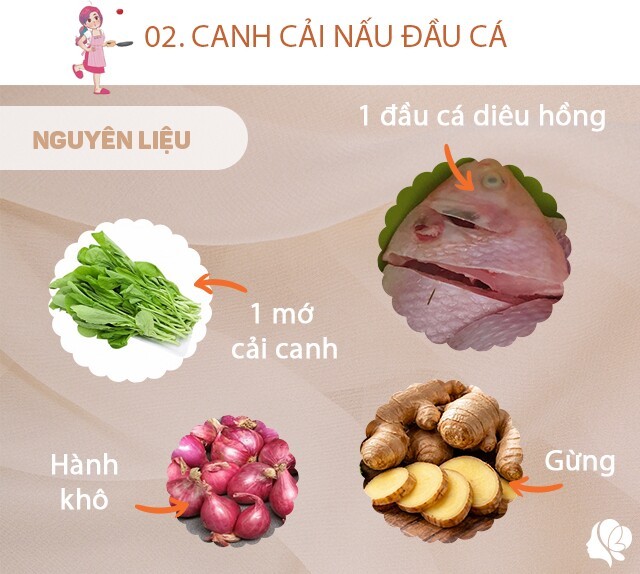Chuẩn bị: 1 cái đầu cá diêu hồng bổ đôi, 1 mớ cải canh, muối, dầu ăn, hành khô, gừng.