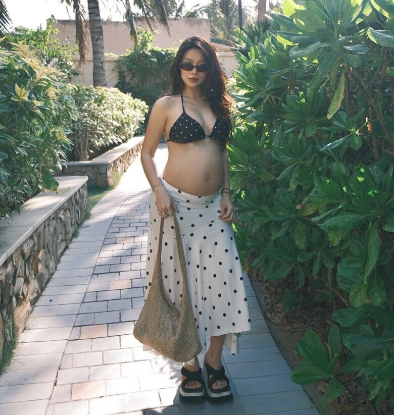 Trong loạt ảnh mới được chia sẻ, bà mẹ một con gây chú ý khi diện bikini thiết kế tối giản, táo bạo khoe trọn bụng bầu căng tròn. Dù vòng hai đã “vượt mặt”, tổng thể vóc dáng của cô vẫn rất thanh thoát. Làn da vùng bụng căng mịn, gần như không thấy vết rạn. Nhiều người nhận xét, nếu không nhìn kỹ, khó tin đây là một mẹ bầu đang ở tháng cuối thai kỳ.