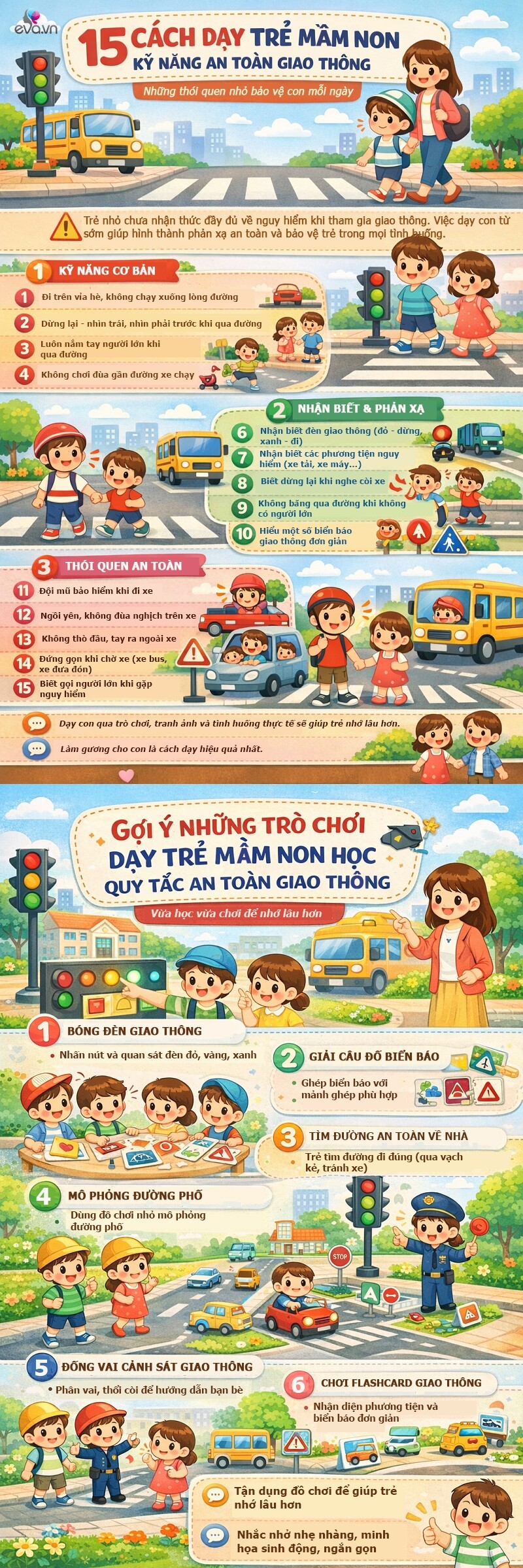 Khi được học bằng trải nghiệm, trẻ sẽ dễ ghi nhớ hơn những nguyên tắc cơ bản như dừng lại trước khi qua đường, nhận biết đèn tín hiệu hay luôn đi cùng người lớn. Đồng thời, việc bố mẹ làm gương, như đội mũ bảo hiểm, chấp hành luật giao thông cũng có tác động rất lớn đến hành vi của trẻ.