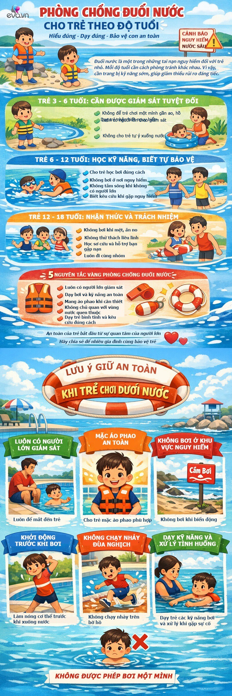 Với trẻ từ 6 - 12 tuổi, khả năng nhận thức và vận động đã tốt hơn, đây là “thời điểm vàng” để học bơi và kỹ năng sinh tồn dưới nước. Trong khi đó, trẻ từ 12 - 18 tuổi, trẻ đã có ý thức rõ ràng hơn nhưng lại dễ chủ quan, thích khám phá và thử thách. Vì vậy, việc giáo dục lúc này cần tập trung vào ý thức trách nhiệm và kỹ năng ứng phó nâng cao.