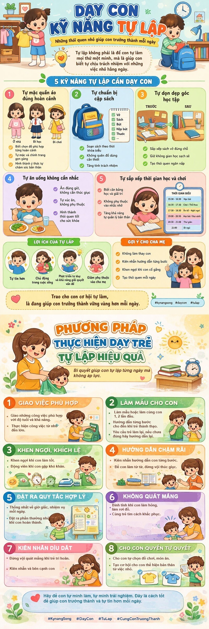Hãy bắt đầu từ những việc phù hợp với độ tuổi, hướng dẫn từng bước rõ ràng, sau đó lùi lại để con tự thực hiện. Khi con làm tốt, một lời khen kịp thời sẽ tiếp thêm động lực, hay khi con làm chưa tốt, sự nhẹ nhàng góp ý sẽ giúp con học hỏi mà không cảm thấy áp lực.