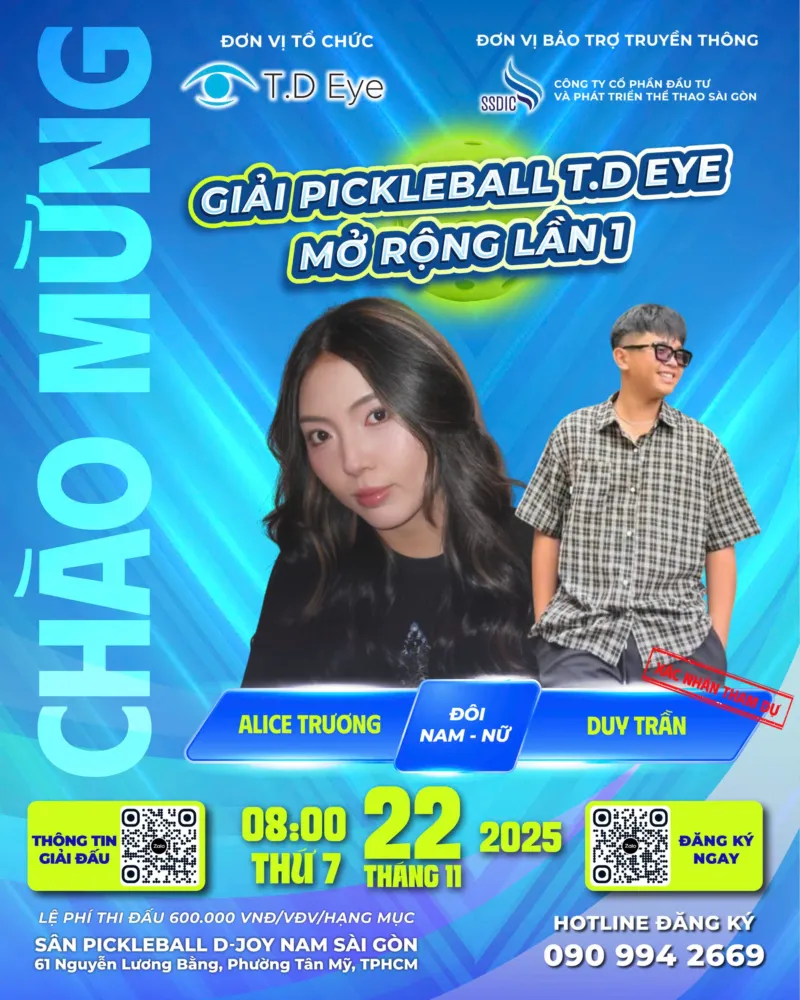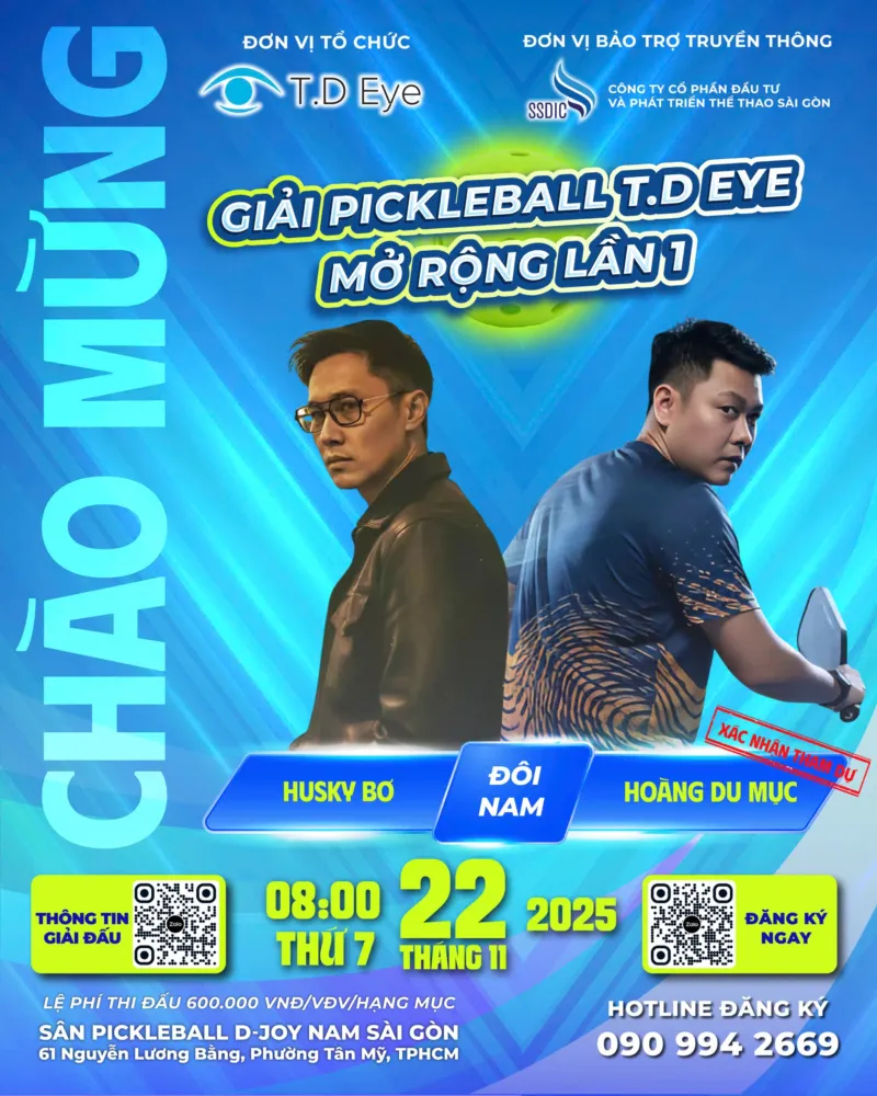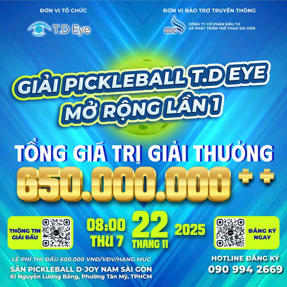 Giải Pickleball TD Eyes mở rộng 2025 sắp diễn ra, mang đến một sân chơi tốc độ, kỹ thuật và kịch tính cho cộng đồng Pickleball tại TP.HCM. Với tổng giải thưởng hơn 650 triệu đồng, giải đấu năm nay hứa hẹn những trận thi đấu đầy hấp dẫn, thu hút sự quan tâm của nhiều vận động viên trong và ngoài nước.