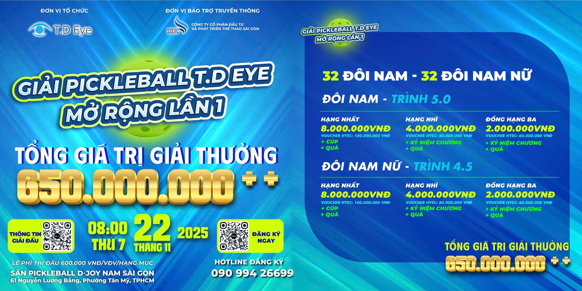 Giải Pickleball TD Eye mở rộng 2025 sắp khai mạc, mang đến sân chơi hấp dẫn và gắn kết cộng đồng cho những người yêu thể thao tại TP.HCM. Với tổng giải thưởng hơn 650 triệu đồng, cùng nhiều ưu đãi hấp dẫn, giải đấu vừa tạo cơ hội thi đấu vừa nâng cao trải nghiệm và sức khỏe cho vận động viên.