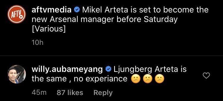 Đó cũng là điểm ưu lớn nhất của Arteta, nhưng với nhiều người, đó vẫn là chưa đủ. Điển hình như anh trai của Pierre-Emerick Aubameyang đã không ngần ngại bình luận về việc Arteta tới Arsenal trên Twitter rằng: “Ljungberg và Arteta chẳng khác gì nhau. Họ đều không có kinh nghiệm."