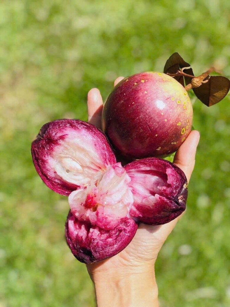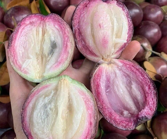 Điểm dễ nhận biết nhất của loại vú sữa này là trái to, tròn đều, kích thước khoảng 7,3–8,4 cm, nặng từ 250–350 gram mỗi quả. Những trái ngon thường chỉ 3–4 quả/kg. Vỏ có màu xanh nhạt khi còn non, dần chuyển sang tím hoặc nâu tía khi chín, bề mặt bóng mịn. Khi bổ ra, phần ruột bên trong có tỷ lệ thịt cao, hạt ít và nhỏ, tỏa hương thơm dịu nhẹ rất đặc trưng.