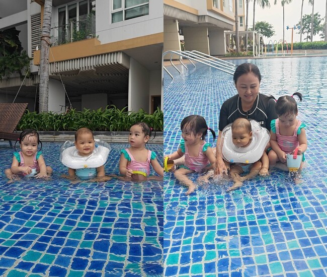 Ông xã H'Hen Niê chia sẻ khoảnh khắc con gái Harley chơi đùa cùng bà tại hồ bơi.
